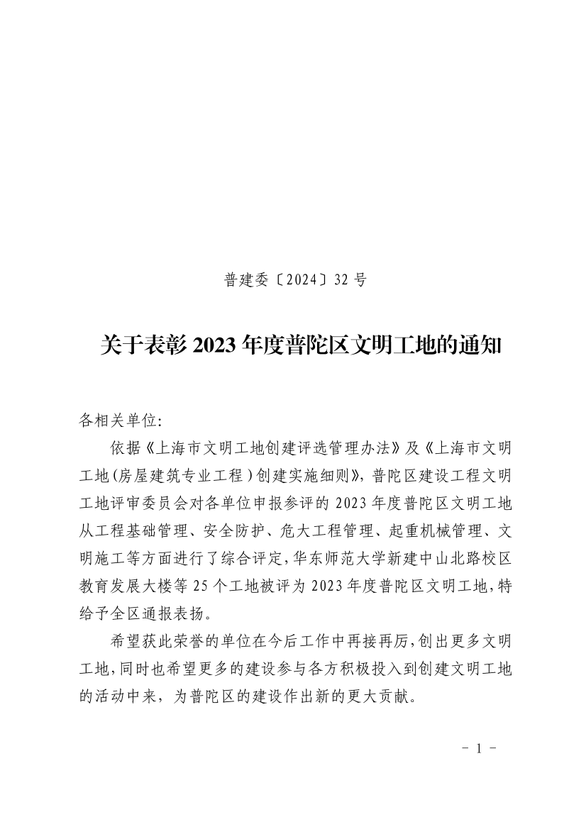 依据《上海市文明工地创建评选管理办法》及《上海市文明工地(房屋建筑专业工程)创建实施细则》,普陀区建设工程文明工地评审委员会对各单位申报参评的2023年度普陀区文明工地从工程基础管理、安全防护、危大工程管理、起重机械管理、文明施工等方面进行了综合评定,华东师范大学新建中山北路校区教育发展大楼等25个工地被评为2023年度普陀区文明工地,特给予全区通报表扬。