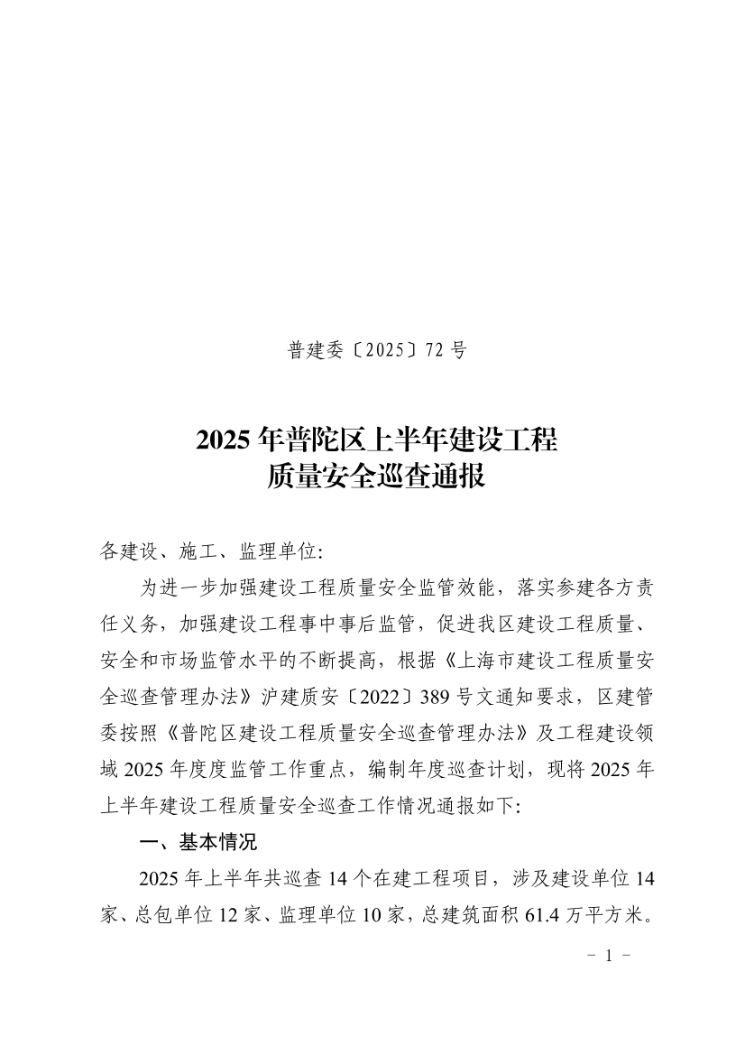 为进一步加强建设工程质量安全监管效能,落实参建各方责任义务,加强建设工程事中事后监管,促进我区建设工程质量、安全和市场监管水平的不断提高,根据《上海市建设工程质量安全巡查管理办法》沪建质安〔2022〕389号文通知要求,区建管委按照《普陀区建设工程质量安全巡查管理办法》及工程建设领域2025年度度监管工作重点,编制年度巡查计划,现将2025年上半年建设工程质量安全巡查工作情况通报如下: