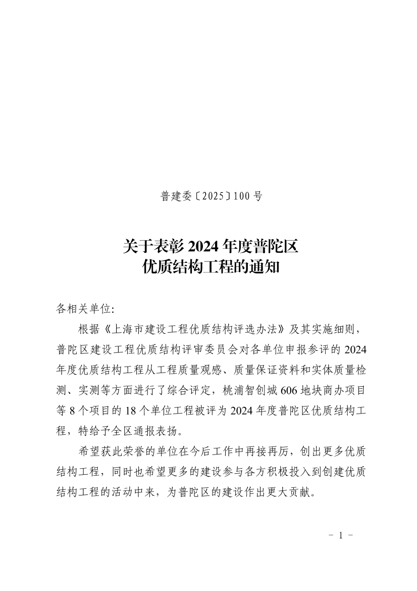 根据《上海市建设工程优质结构评选办法》及其实施细则,普陀区建设工程优质结构评审委员会对各单位申报参评的2024年度优质结构工程从工程质量观感、质量保证资料和实体质量检测、实测等方面进行了综合评定,桃浦智创城606地块商办项目等8个项目的18个单位工程被评为2024年度普陀区优质结构工程,特给予全区通报表扬。