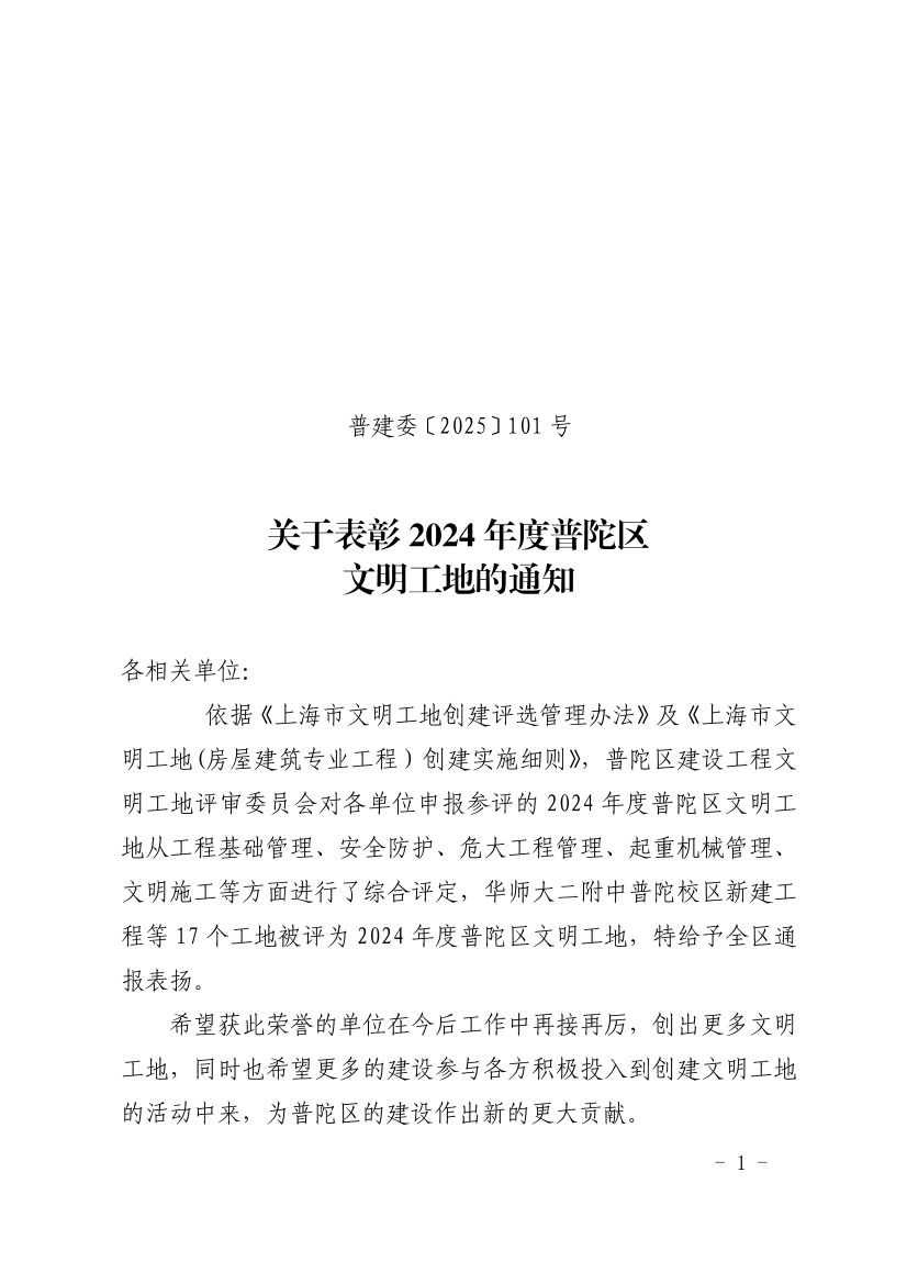 依据《上海市文明工地创建评选管理办法》及《上海市文明工地(房屋建筑专业工程)创建实施细则》,普陀区建设工程文明工地评审委员会对各单位申报参评的2024年度普陀区文明工地从工程基础管理、安全防护、危大工程管理、起重机械管理、文明施工等方面进行了综合评定,华师大二附中普陀校区新建工程等17个工地被评为2024年度普陀区文明工地,特给予全区通报表扬。