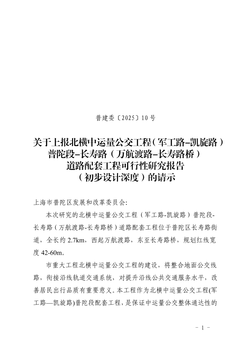 关于上报北横中运量公交工程(军工路-凯旋路)普陀段-长寿路(万航渡路-长寿路桥) 道路配套工程可行性研究报告 (初步设计深度)的请示