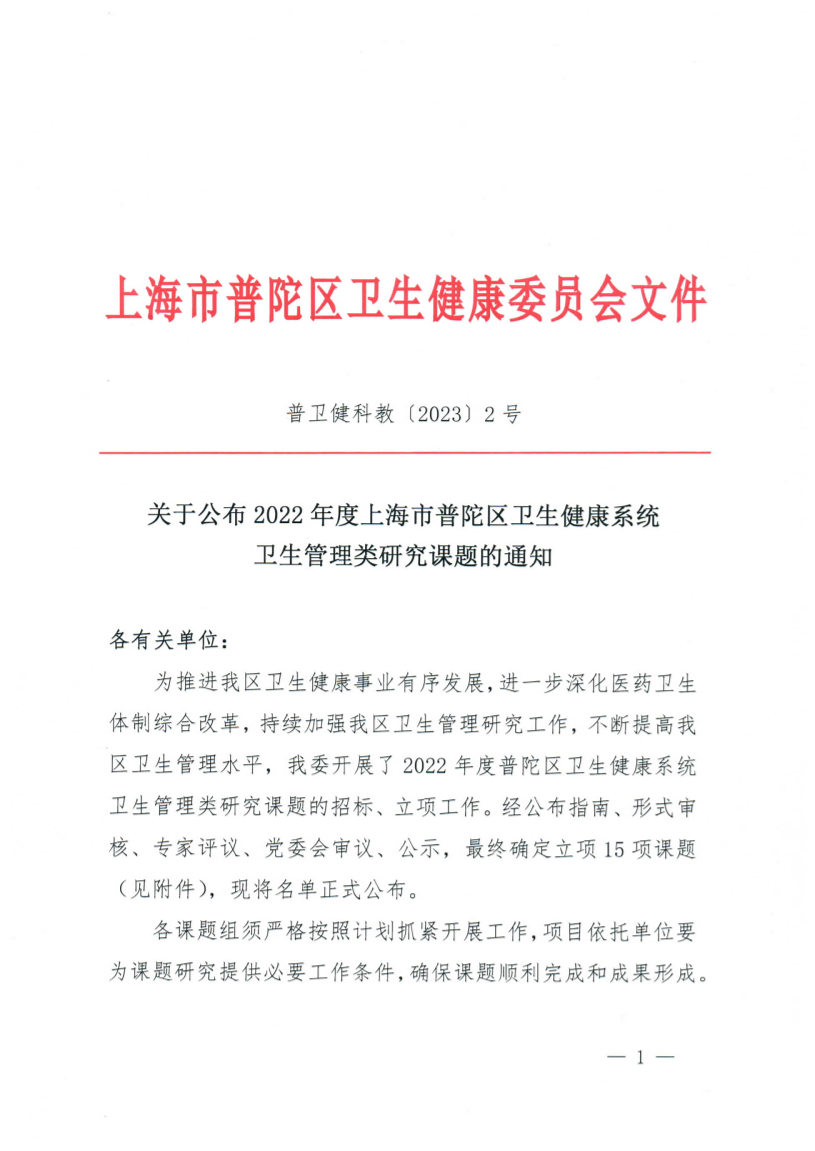 关于公布2022年度上海市普陀区卫生健康系统卫生管理类研究课题的通知