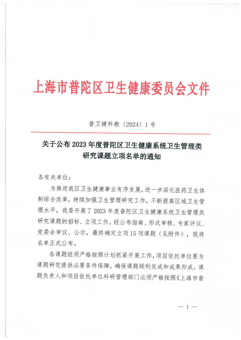 关于公布2023年度普陀区卫生健康系统卫生管理类研究课题立项名单的通知