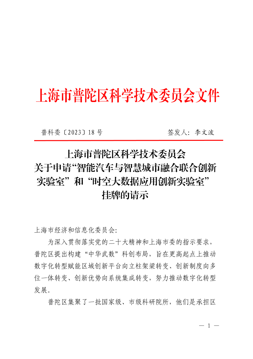 上海市普陀区科学技术委员会关于申请“智能汽车与智慧城市融合联合创新实验室”和“时空大数据应用创新实验室”挂牌的请示