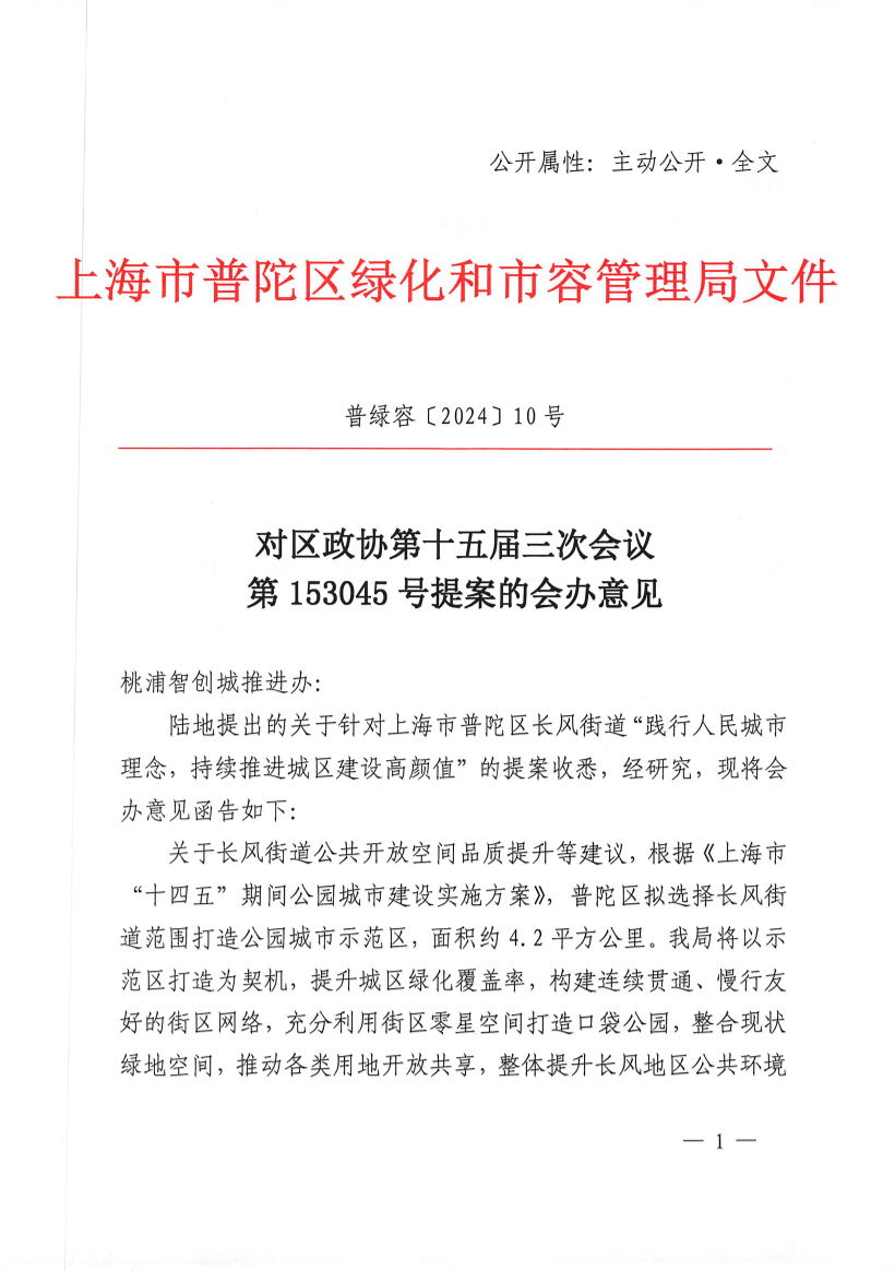 陆地提出的关于针对上海市普陀区长风街道“践行人民城市理念,持续推进城区建设高颜值”的提案收悉,经研究,现将会办意见函告如下: