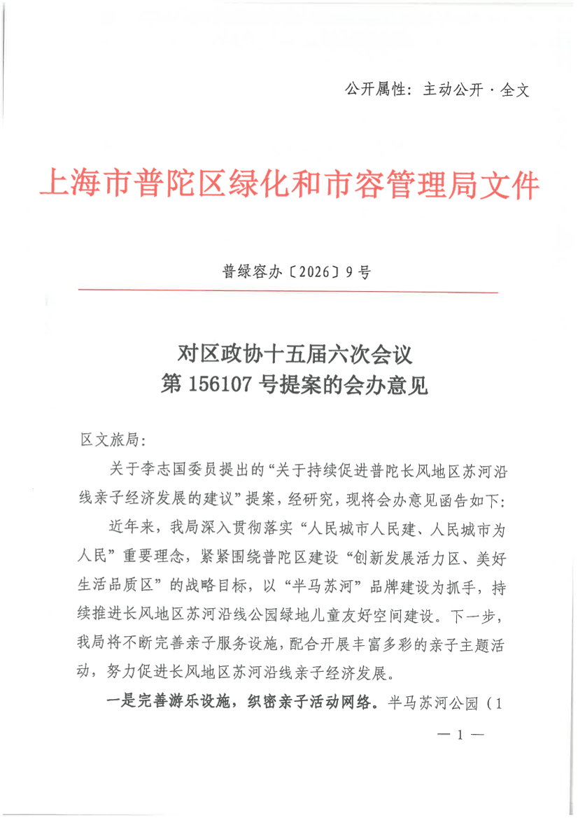 关于李志国委员提出的“关于持续促进普陀长风地区苏河沿线亲子经济发展的建议”提案,经研究,现将会办意见函告如下: