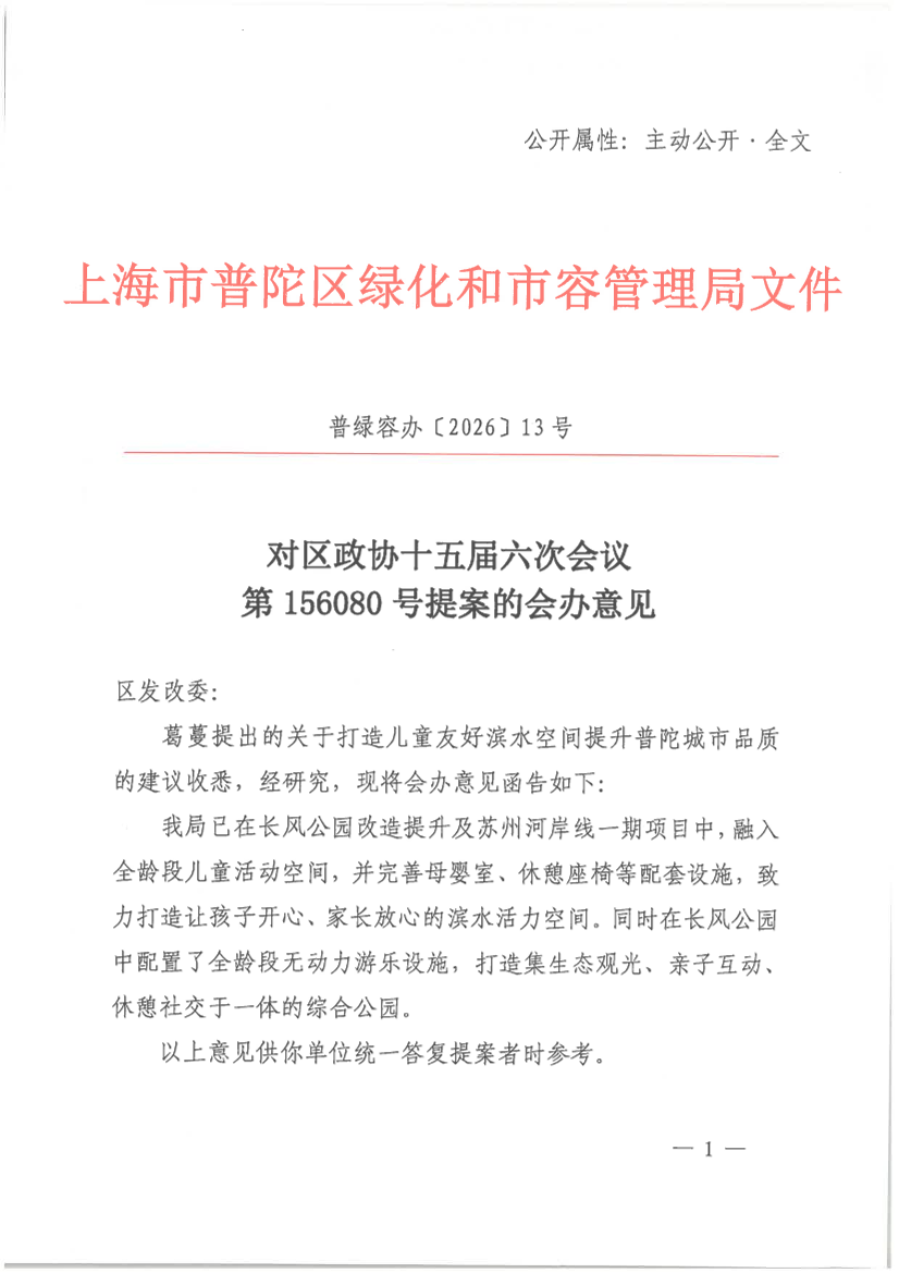 葛蔓提出的关于打造儿童友好滨水空间提升普陀城市品质的建议收悉,经研究,现将会办意见函告如下: