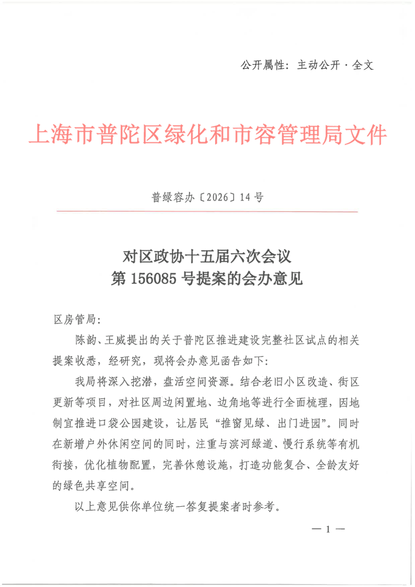 陈韵、王威提出的关于普陀区推进建设完整社区试点的相关提案收悉,经研究,现将会办意见函告如下: