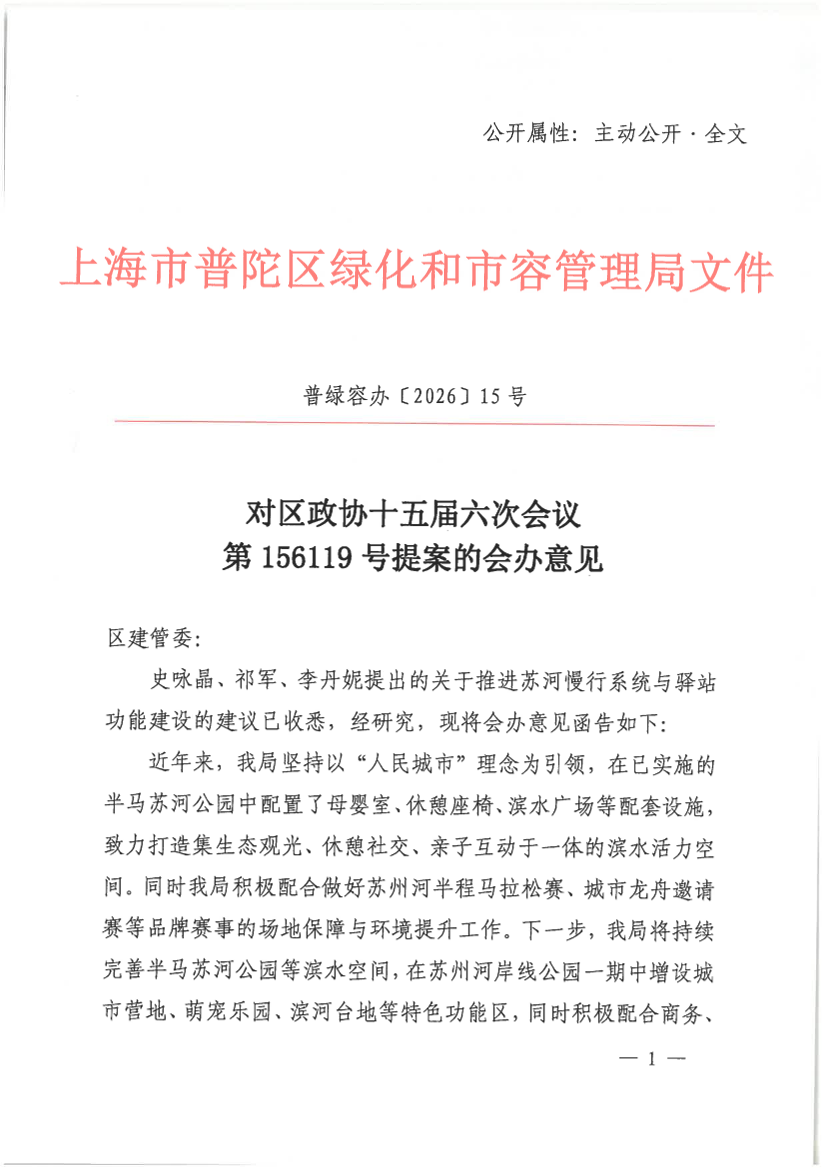 史咏晶、祁军、李丹妮提出的关于推进苏河慢行系统与驿站功能建设的建议已收悉,经研究,现将会办意见函告如下: