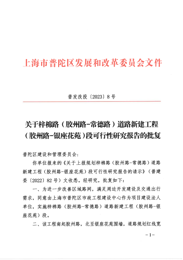 你单位报来的《关于上报规划梓棉路(胶州路-常德路)道路新建工程(胶州路-银座花苑)段可行性研究报告的请示》(普建委〔2022〕82号)文收悉。经研究,批复如下: