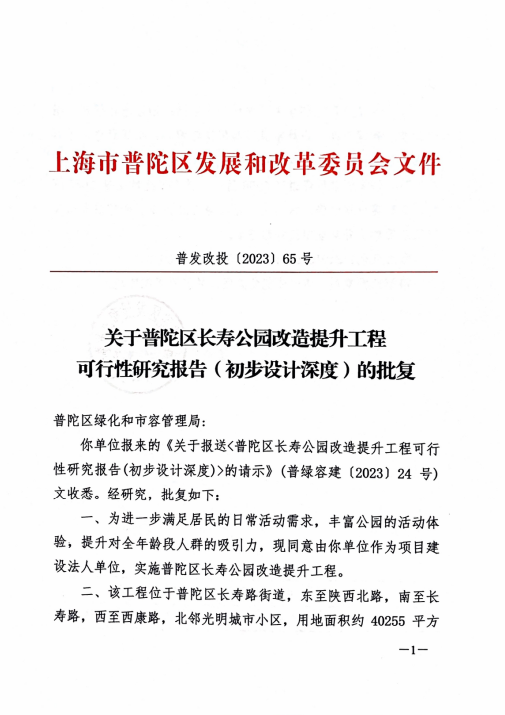 你单位报来的《关于报送<普陀区长寿公园改造提升工程可行性研究报告(初步设计深度)>的请示》(普绿容建〔2023〕24号)文收悉。经研究,批复如下: