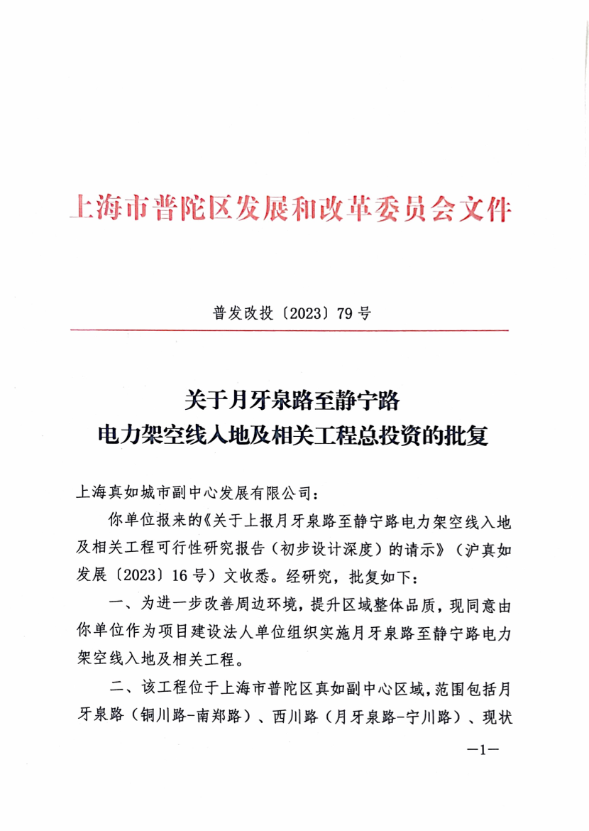 你单位报来的《关于上报月牙泉路至静宁路电力架空线入地及相关工程可行性研究报告(初步设计深度)的请示》(沪真如发展〔2023〕16号)文收悉。经研究,批复如下: