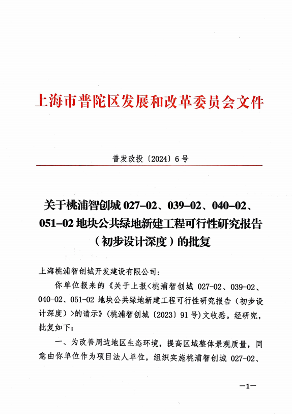 一、为改善周边地区生态环境,提高区域整体景观质量,同意由你单位作为项目法人单位,组织实施桃浦智创城027-02、039-02、040-02、051-02地块公共绿地新建工程。
