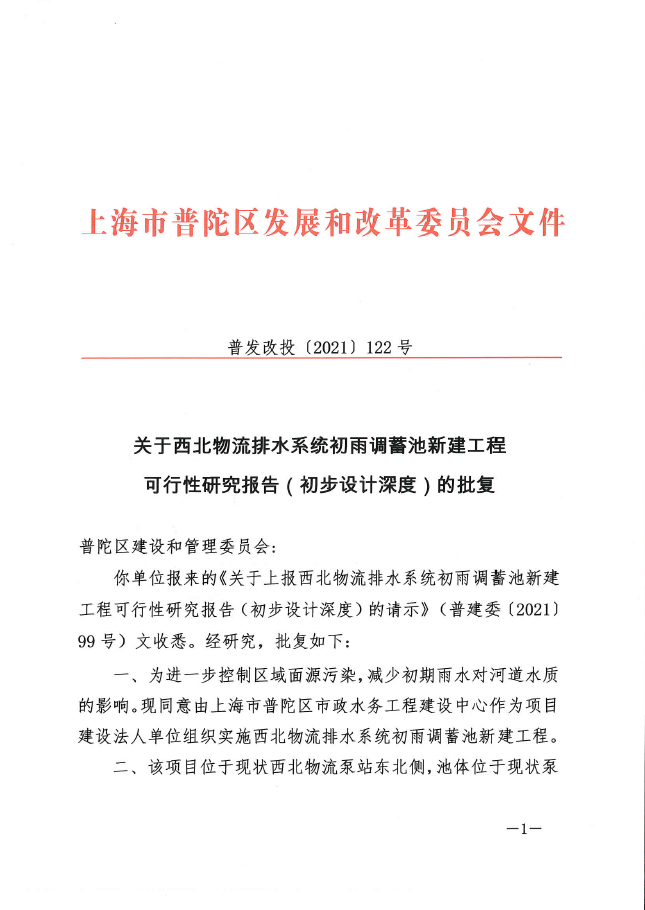 你单位报来的《关于上报西北物流排水系统初雨调蓄池新建工程可行性研究报告(初步设计深度)的请示》(普建委〔2021〕99号)文收悉。经研究,批复如下: