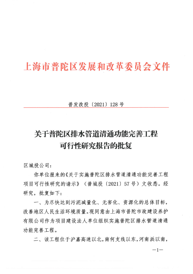 你单位报来的《关于实施普陀区排水管道清通功能完善工程项目可行性研究的请示》(普城投〔2021〕57号)文收悉。经研究,批复如下:
