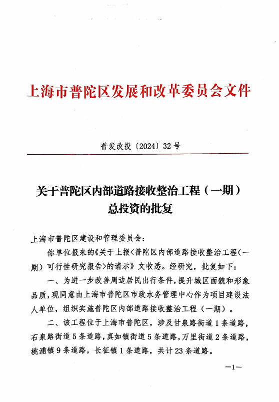 一、为进一步改善周边居民出行条件,提升城区面貌和形象品质,现同意由上海市普陀区市政水务管理中心作为项目建设法人单位,组织实施普陀区内部道路接收整治工程(一期)。