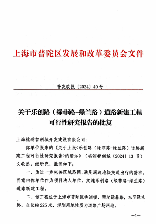 你单位报来的《关于上报<乐创路(绿菲路-绿兰路)道路新建工程可行性研究报告>的请示》(桃浦智创城〔2024〕13号)文收悉。经研究,批复如下: