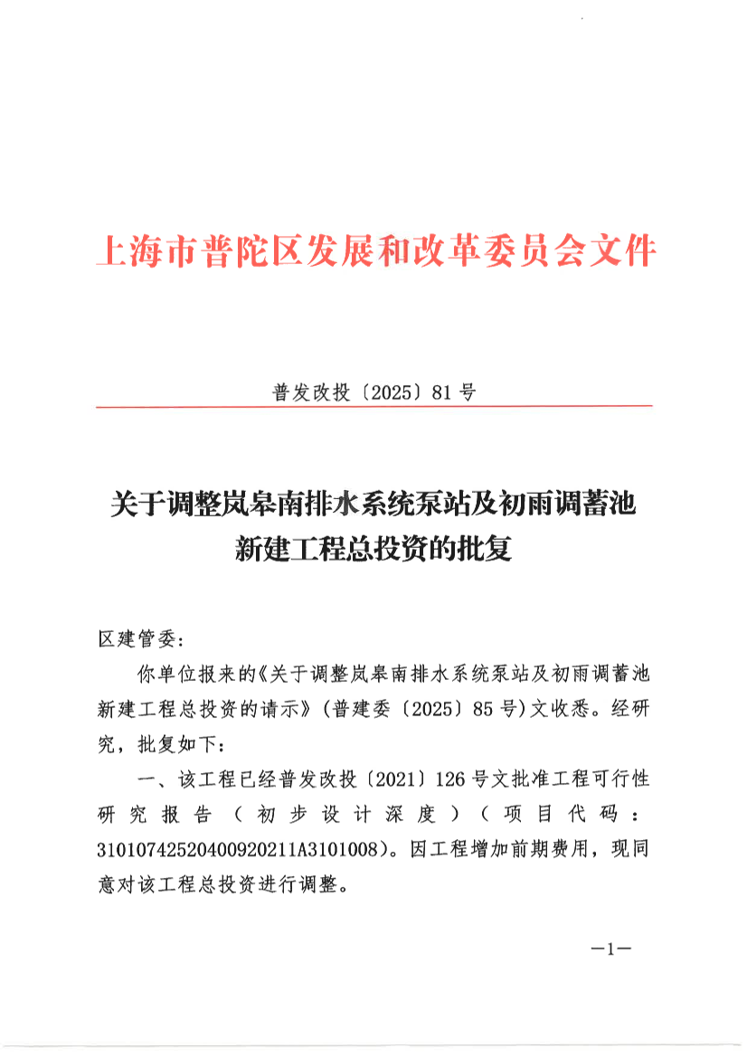 你单位报来的《关于调整岚皋南排水系统泵站及初雨调蓄池新建工程总投资的请示》(普建委〔2025〕85号)文收悉。经研究,批复如下: