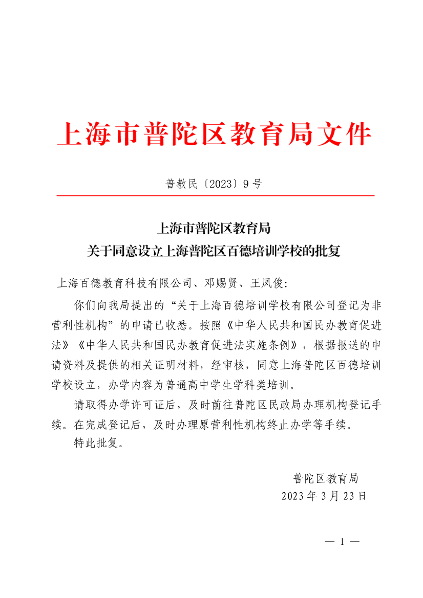 你们向我局提出的“关于上海百德培训学校有限公司登记为非营利性机构”的申请已收悉。按照《中华人民共和国民办教育促进法》《中华人民共和国民办教育促进法实施条例》,根据报送的申请资料及提供的相关证明材料,经审核,同意上海普陀区百德培训学校设立,办学内容为普通高中学生学科类培训。