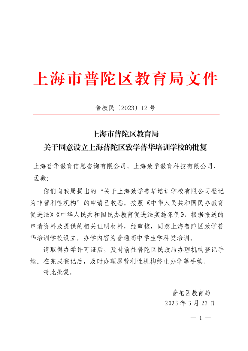 你们向我局提出的“关于上海致学普华培训学校有限公司登记为非营利性机构”的申请已收悉。按照《中华人民共和国民办教育促进法》《中华人民共和国民办教育促进法实施条例》,根据报送的申请资料及提供的相关证明材料,经审核,同意上海普陀区致学普华培训学校设立,办学内容为普通高中学生学科类培训。