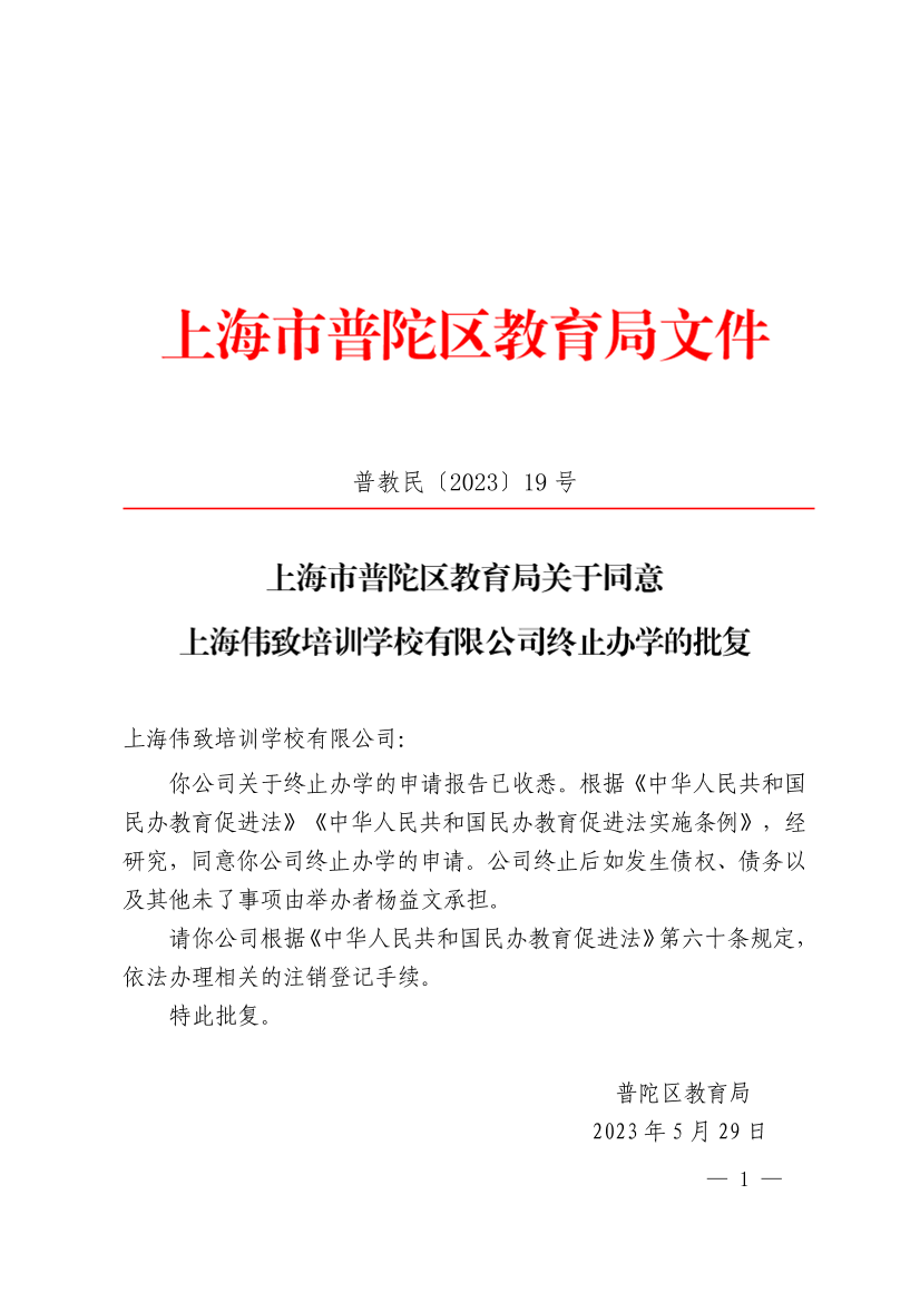 关于同意上海伟致培训学校有限公司终止办学的批复