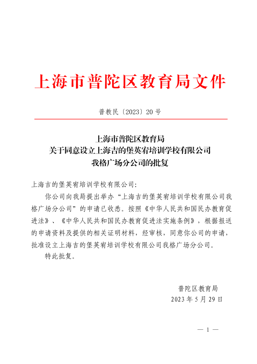 你公司向我局提出举办“上海吉的堡英宥培训学校有限公司我格广场分公司”的申请已收悉。按照《中华人民共和国民办教育促进法》、《中华人民共和国民办教育促进法实施条例》,根据报送的申请资料及提供的相关证明材料,经审核,同意你公司的申请,批准设立上海吉的堡英宥培训学校有限公司我格广场分公司。