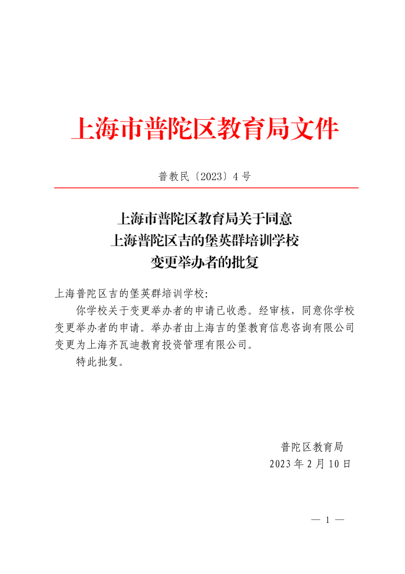 你学校关于变更举办者的申请已收悉。经审核,同意你学校变更举办者的申请。举办者由上海吉的堡教育信息咨询有限公司变更为上海齐瓦迪教育投资管理有限公司。