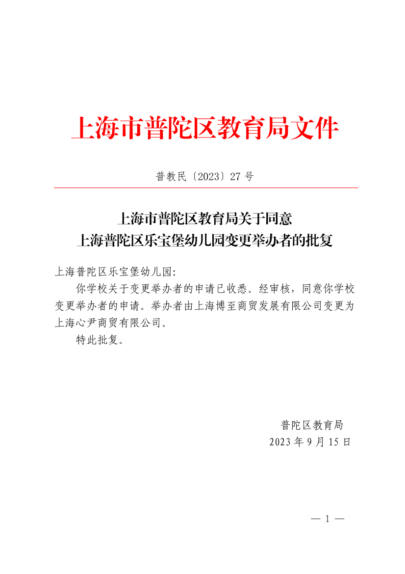 你学校关于变更举办者的申请已收悉。经审核,同意你学校变更举办者的申请。举办者由上海博至商贸发展有限公司变更为上海心尹商贸有限公司。