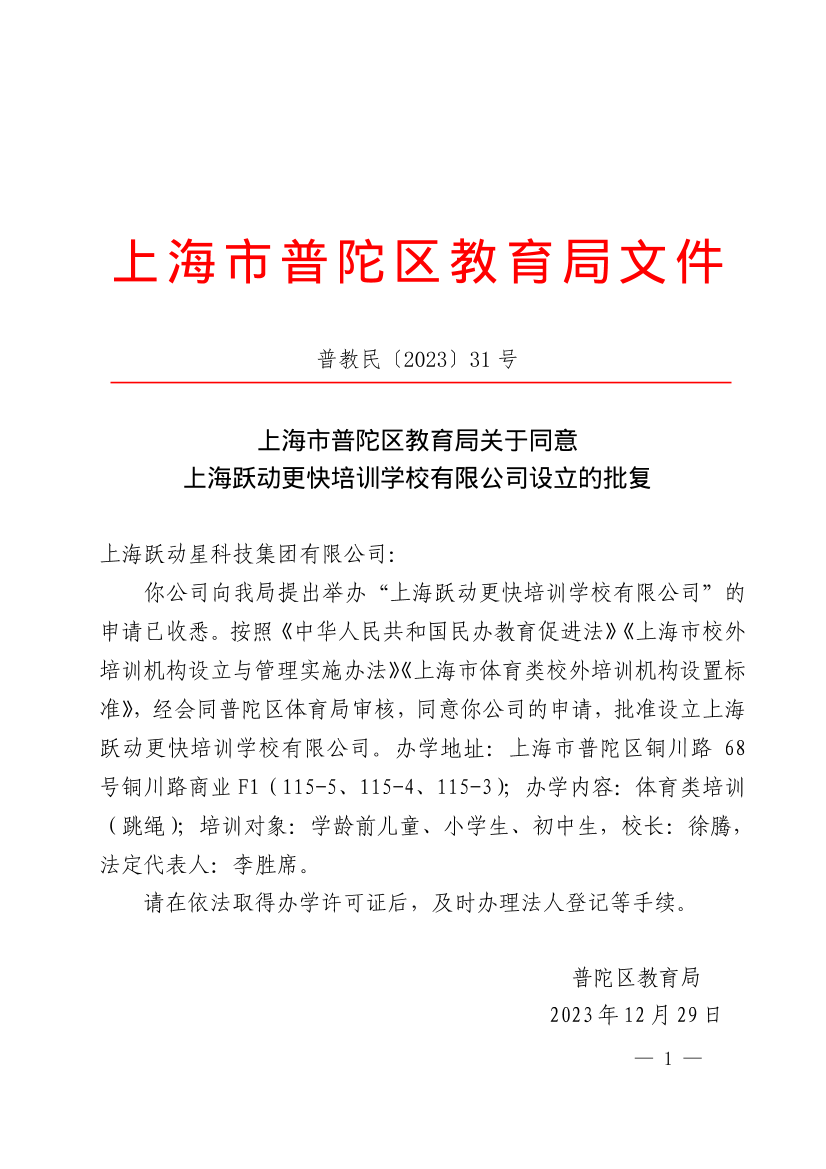 你公司向我局提出举办“上海跃动更快培训学校有限公司”的申请已收悉。按照《中华人民共和国民办教育促进法》《上海市校外培训机构设立与管理实施办法》《上海市体育类校外培训机构设置标准》,经会同普陀区体育局审核,同意你公司的申请,批准设立上海跃动更快培训学校有限公司。办学地址:上海市普陀区铜川路68号铜川路商业F1(115-5、115-4、115-3);办学内容:体育类培训(跳绳);培训对象:学龄前儿童、小学生、初中生,校长:徐腾,法定代表人:李胜席。