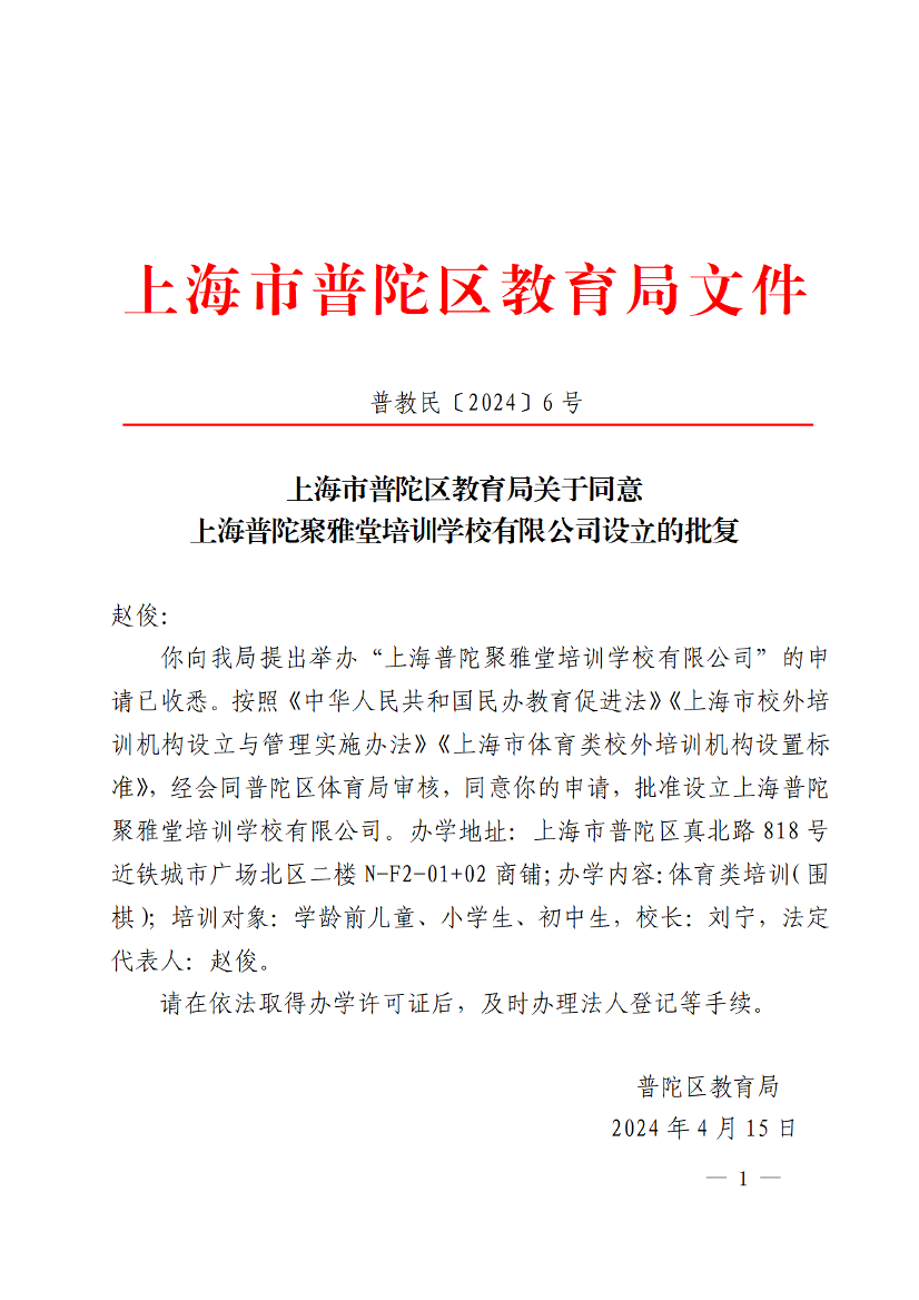 你向我局提出举办“上海普陀聚雅堂培训学校有限公司”的申请已收悉。按照《中华人民共和国民办教育促进法》《上海市校外培训机构设立与管理实施办法》《上海市体育类校外培训机构设置标准》,经会同普陀区体育局审核,同意你的申请,批准设立上海普陀聚雅堂培训学校有限公司。办学地址:上海市普陀区真北路818号近铁城市广场北区二楼N-F2-01+02商铺;办学内容:体育类培训(围棋);培训对象:学龄前儿童、小学生、初中生,校长:刘宁,法定代表人:赵俊。