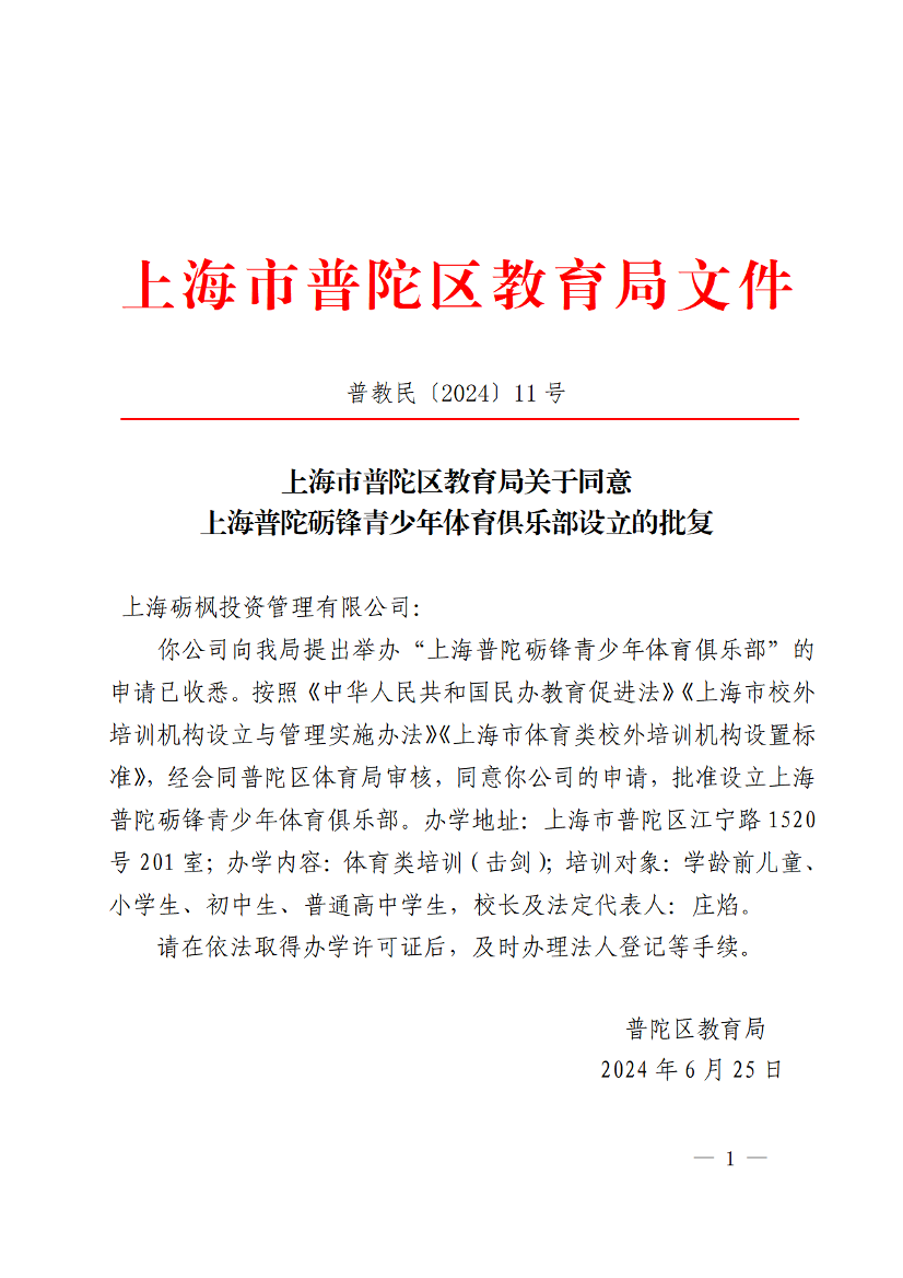 你公司向我局提出举办“上海普陀砺锋青少年体育俱乐部”的申请已收悉。按照《中华人民共和国民办教育促进法》《上海市校外培训机构设立与管理实施办法》《上海市体育类校外培训机构设置标准》,经会同普陀区体育局审核,同意你公司的申请,批准设立上海普陀砺锋青少年体育俱乐部。办学地址:上海市普陀区江宁路1520号201室;办学内容:体育类培训(击剑);培训对象:学龄前儿童、小学生、初中生、普通高中学生,校长及法定代表人:庄焰。
