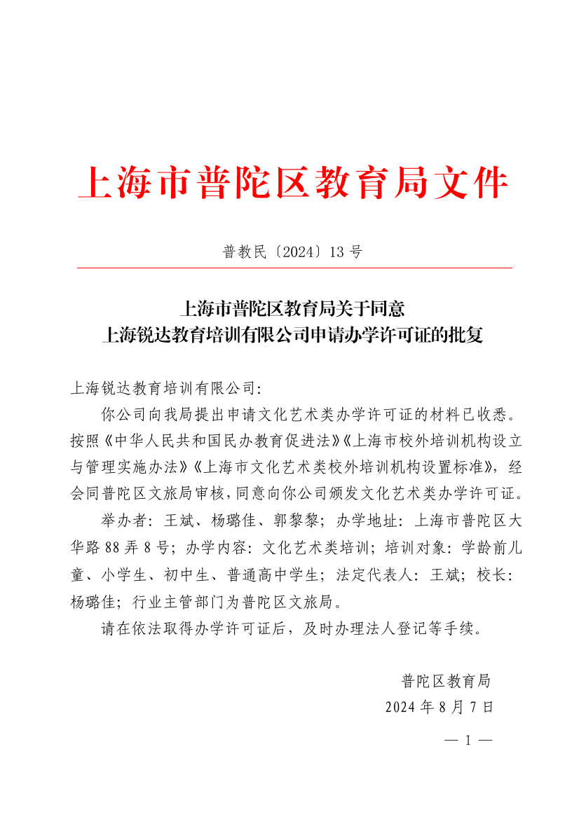 你公司向我局提出申请文化艺术类办学许可证的材料已收悉。按照《中华人民共和国民办教育促进法》《上海市校外培训机构设立与管理实施办法》《上海市文化艺术类校外培训机构设置标准》,经会同普陀区文旅局审核,同意向你公司颁发文化艺术类办学许可证。