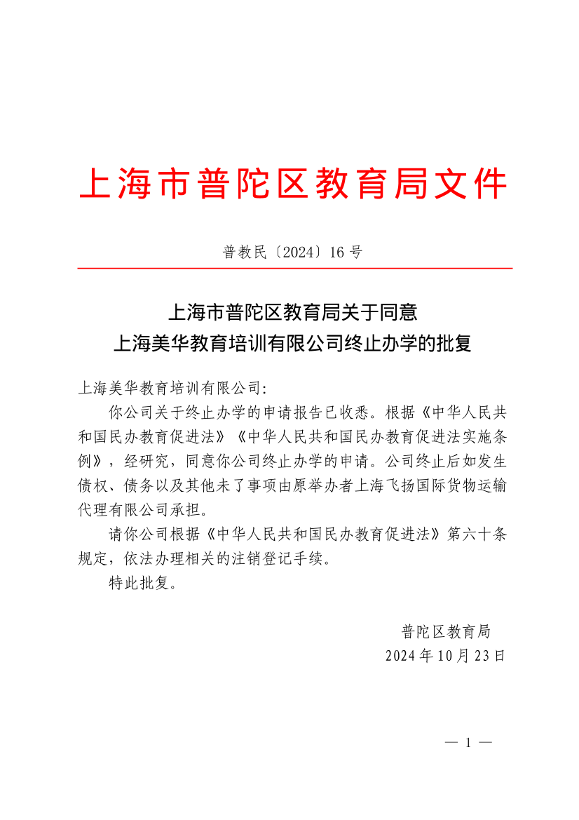 你公司关于终止办学的申请报告已收悉。根据《中华人民共和国民办教育促进法》《中华人民共和国民办教育促进法实施条例》,经研究,同意你公司终止办学的申请。公司终止后如发生债权、债务以及其他未了事项由原举办者上海飞扬国际货物运输代理有限公司承担。