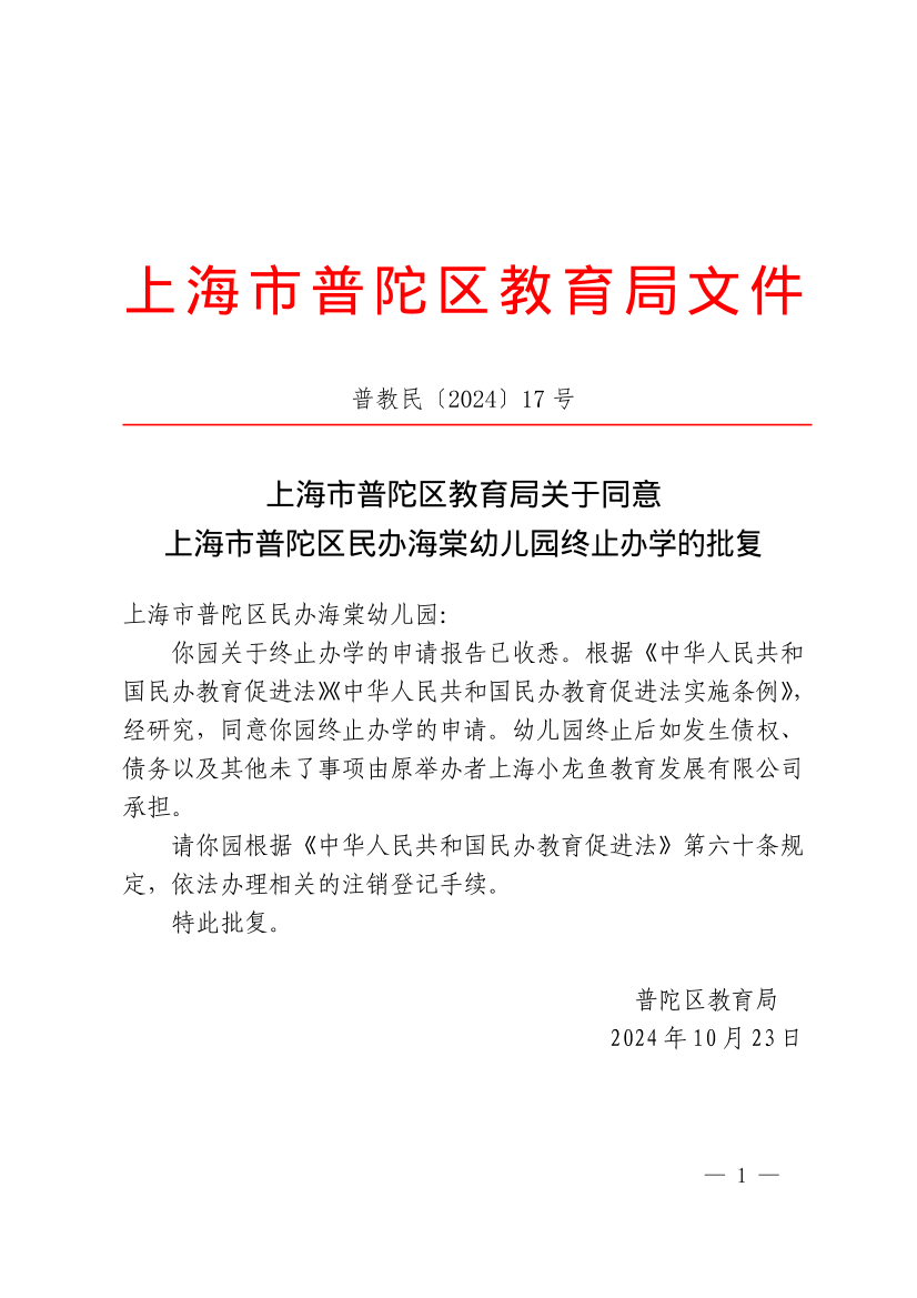 你园关于终止办学的申请报告已收悉。根据《中华人民共和国民办教育促进法》《中华人民共和国民办教育促进法实施条例》,经研究,同意你园终止办学的申请。幼儿园终止后如发生债权、债务以及其他未了事项由原举办者上海小龙鱼教育发展有限公司承担。