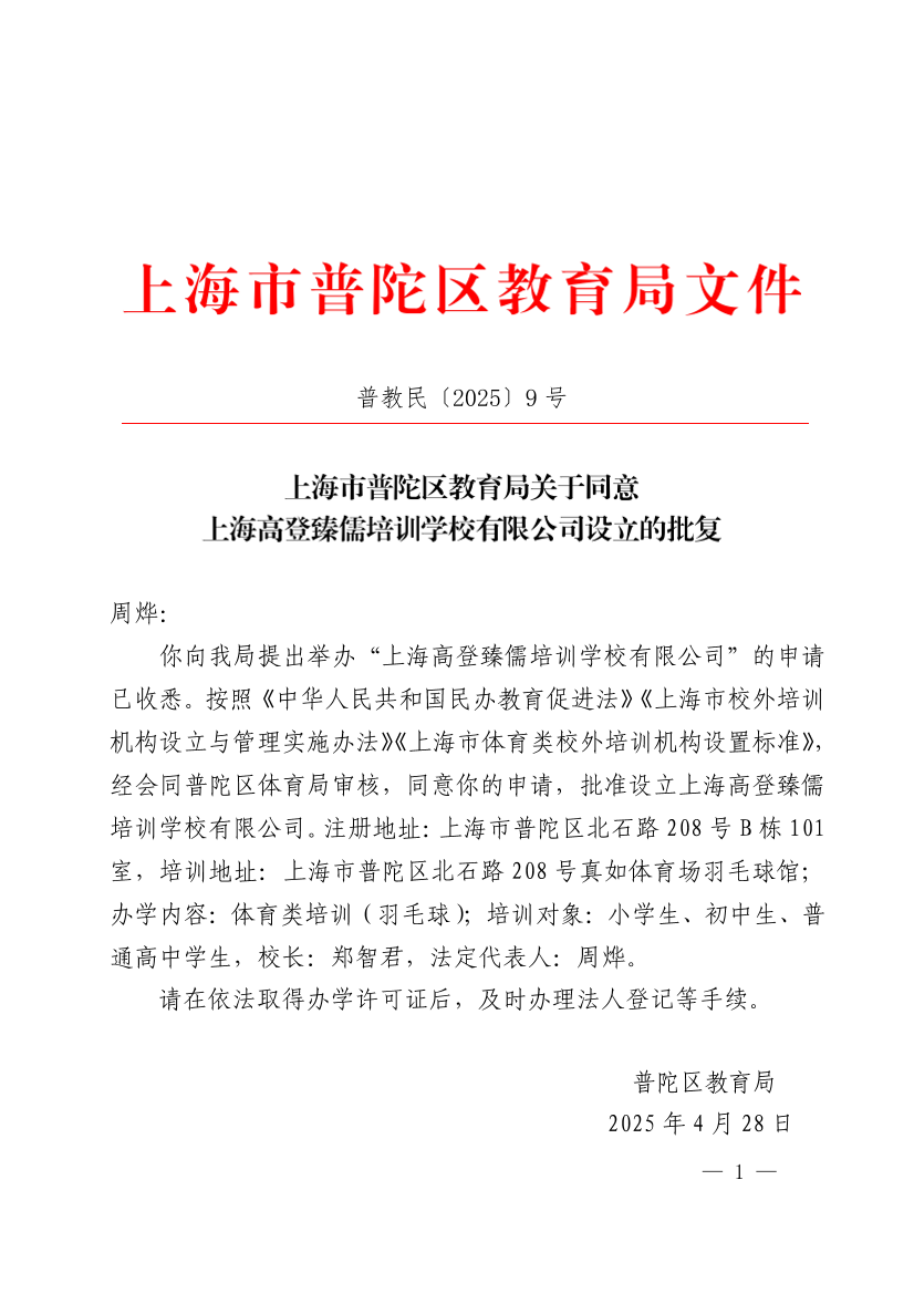 你向我局提出举办“上海高登臻儒培训学校有限公司”的申请已收悉。按照《中华人民共和国民办教育促进法》《上海市校外培训机构设立与管理实施办法》《上海市体育类校外培训机构设置标准》,经会同普陀区体育局审核,同意你的申请,批准设立上海高登臻儒培训学校有限公司。注册地址:上海市普陀区北石路208号B栋101室,培训地址:上海市普陀区北石路208号真如体育场羽毛球馆;办学内容:体育类培训(羽毛球);培训对象:小学生、初中生、普通高中学生,校长:郑智君,法定代表人:周烨。