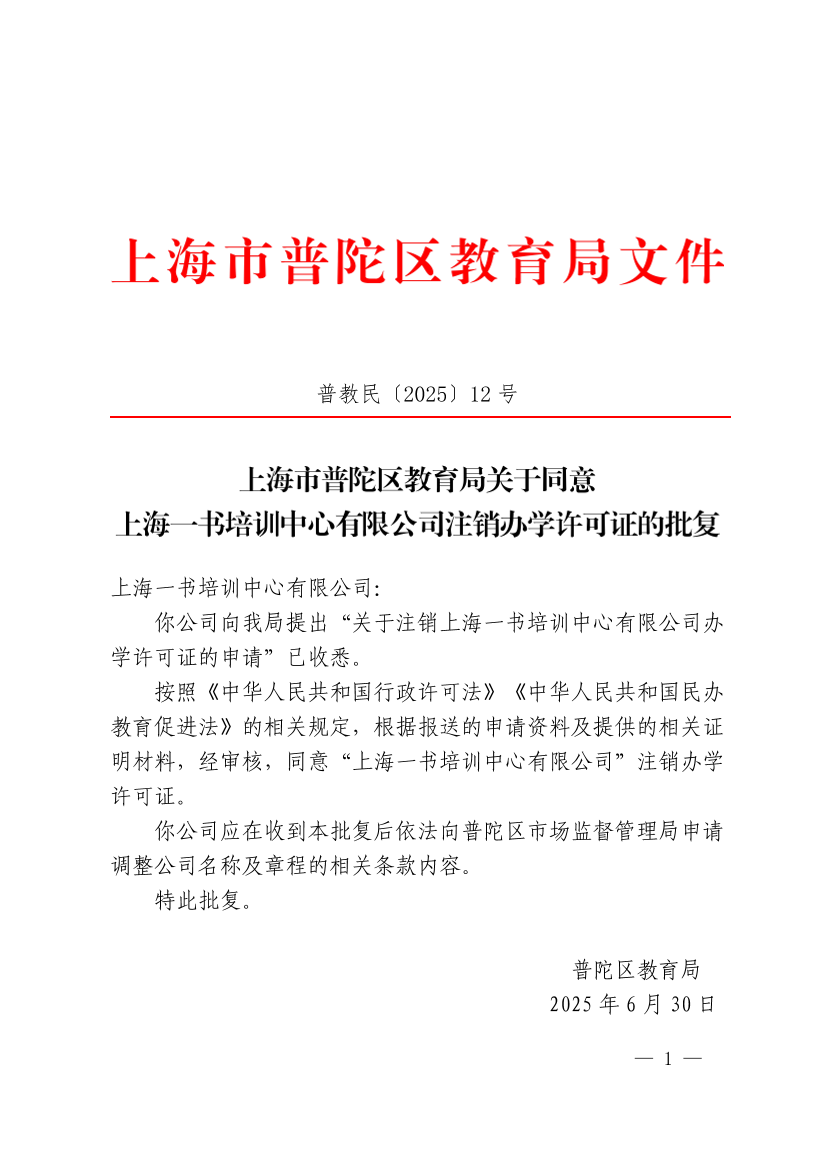 你公司向我局提出“关于注销上海一书培训中心有限公司办学许可证的申请”已收悉。