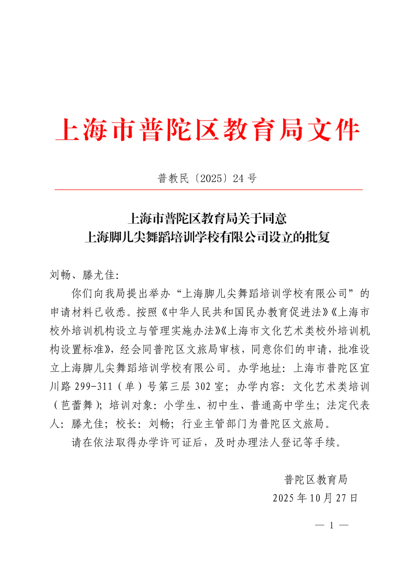 你们向我局提出举办“上海脚儿尖舞蹈培训学校有限公司”的申请材料已收悉。按照《中华人民共和国民办教育促进法》《上海市校外培训机构设立与管理实施办法》《上海市文化艺术类校外培训机构设置标准》,经会同普陀区文旅局审核,同意你们的申请,批准设立上海脚儿尖舞蹈培训学校有限公司。办学地址:上海市普陀区宜川路299-311(单)号第三层302室;办学内容:文化艺术类培训(芭蕾舞);培训对象:小学生、初中生、普通高中学生;法定代表人:滕尤佳;校长:刘畅;行业主管部门为普陀区文旅局。
