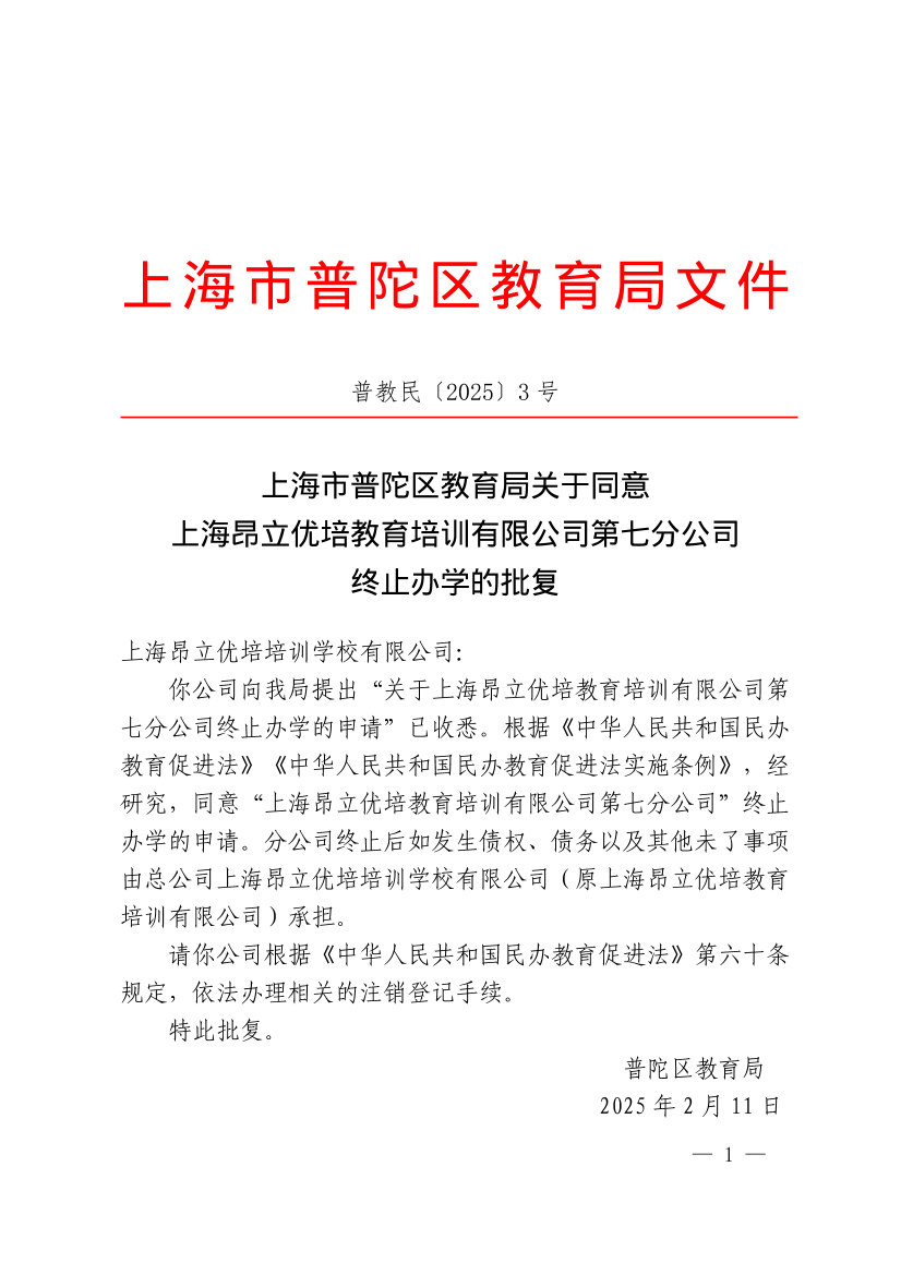 你公司向我局提出“关于上海昂立优培教育培训有限公司第七分公司终止办学的申请”已收悉。根据《中华人民共和国民办教育促进法》《中华人民共和国民办教育促进法实施条例》,经研究,同意“上海昂立优培教育培训有限公司第七分公司”终止办学的申请。分公司终止后如发生债权、债务以及其他未了事项由总公司上海昂立优培培训学校有限公司(原上海昂立优培教育培训有限公司)承担。