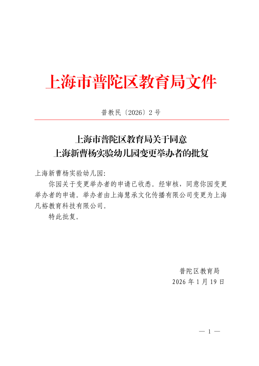 你园关于变更举办者的申请已收悉。经审核,同意你园变更举办者的申请。举办者由上海慧承文化传播有限公司变更为上海凡裕教育科技有限公司。