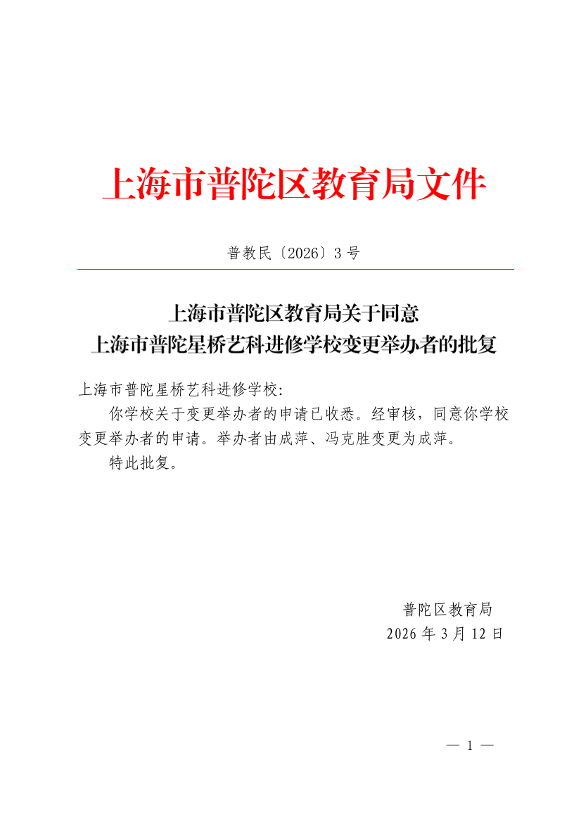 关于同意上海市普陀星桥艺科进修学校变更举办者的批复