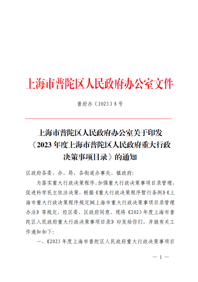 上海市普陀区人民政府办公室关于印发《2023年度上海市普陀区人民政府重大行政决策事项目录》的通知