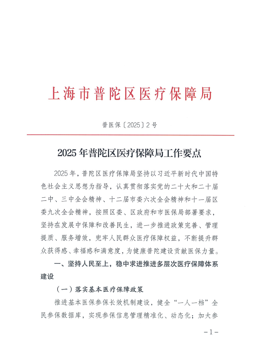 2025年,普陀区医疗保障局坚持以习近平新时代中国特色社会主义思想为指导,认真贯彻落实党的二十大和二十届二中、三中全会精神、十二届市委六次全会精神和十一届区委九次全会精神,按照区委、区政府和市医保局部署要求,坚持在发展中保障和改善民生,进一步推进政策完善、管理提质、服务增效,兜牢人民群众医疗保障权益,不断提升群众获得感、幸福感和满意度,为健康普陀建设贡献医保力量。