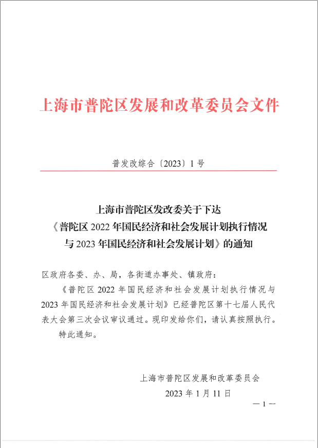 上海市普陀区发改委关于下达《普陀区2022年国民经济和社会发展计划执行情况与2023年国民经济和社会发展计划》的通知