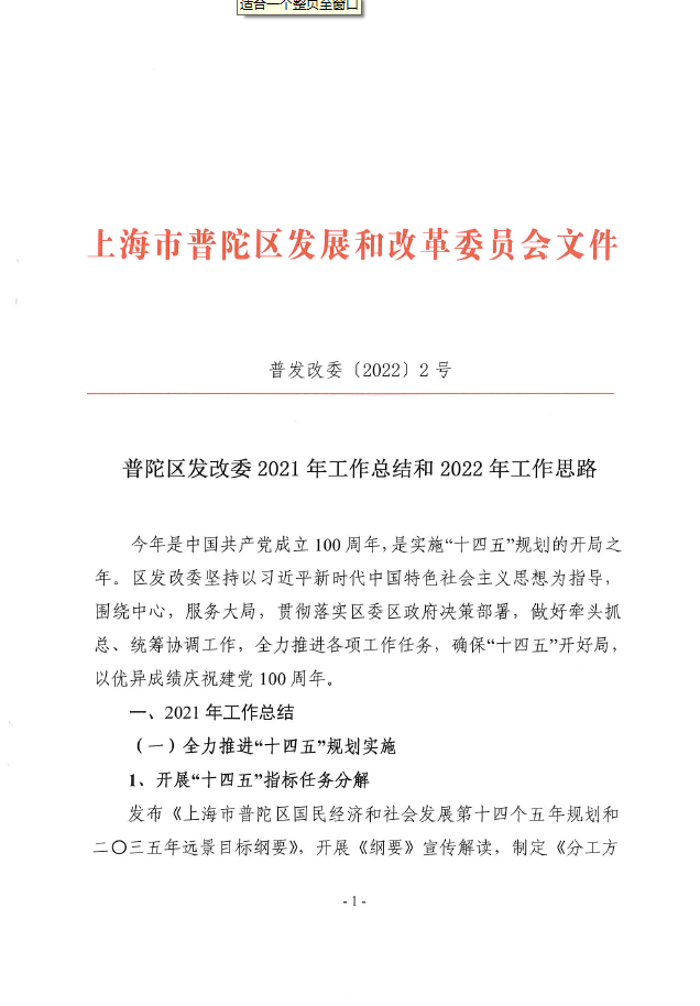 普陀区发改委2021年工作总结和2022年工作思路