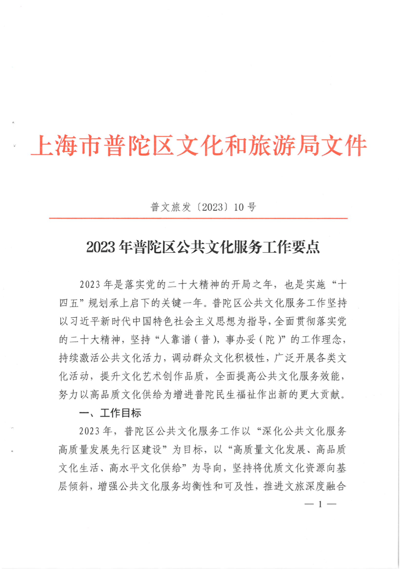 2023年是落实党的二十大精神的开局之年,也是实施“十四五”规划承上启下的关键一年。普陀区公共文化服务工作坚持以习近平新时代中国特色社会主义思想为指导,全面贯彻落实党的二十大精神,坚持“人靠谱(普),事办妥(陀)”的工作理念,持续激活公共文化活力,调动群众文化积极性,广泛开展各类文化活动,提升文化艺术创作品质,全面提高公共文化服务效能,努力以高品质文化供给为增进普陀民生福祉作出新的更大贡献。
