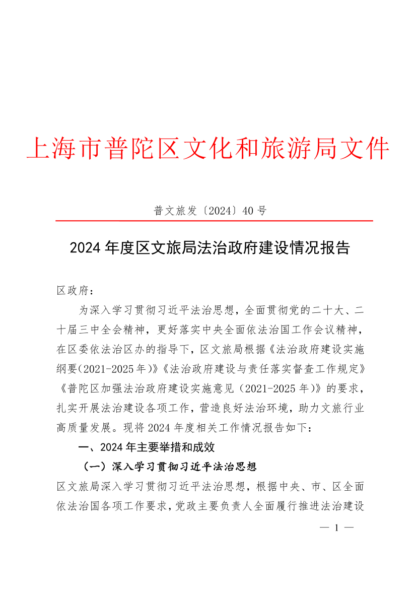 为深入学习贯彻习近平法治思想,全面贯彻党的二十大、二十届三中全会精神,更好落实中央全面依法治国工作会议精神,在区委依法治区办的指导下,区文旅局根据《法治政府建设实施纲要(2021-2025年)》《法治政府建设与责任落实督察工作规定》《普陀区加强法治政府建设实施意见(2021-2025年)》的要求,扎实开展法治建设各项工作,营造良好法治环境,助力文旅行业高质量发展。现将2024年度相关工作情况报告如下:
