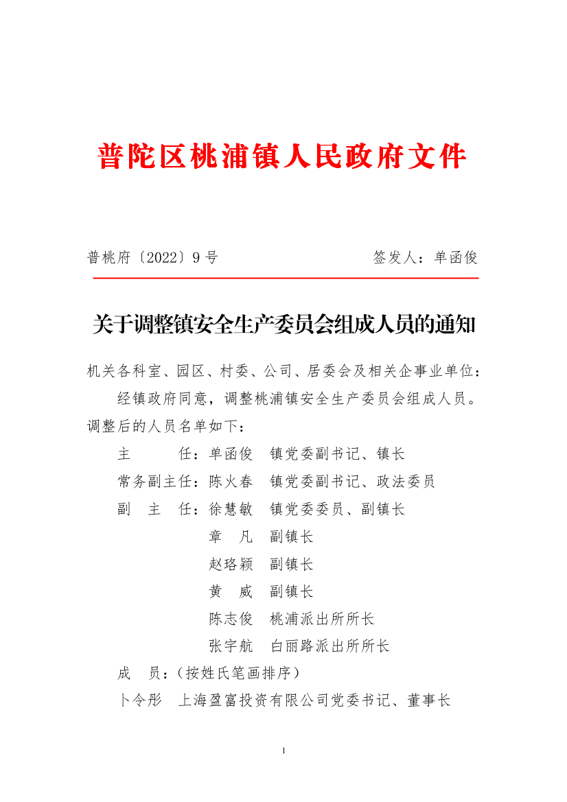 经镇政府同意,调整桃浦镇安全生产委员会组成人员。调整后的人员名单如下: