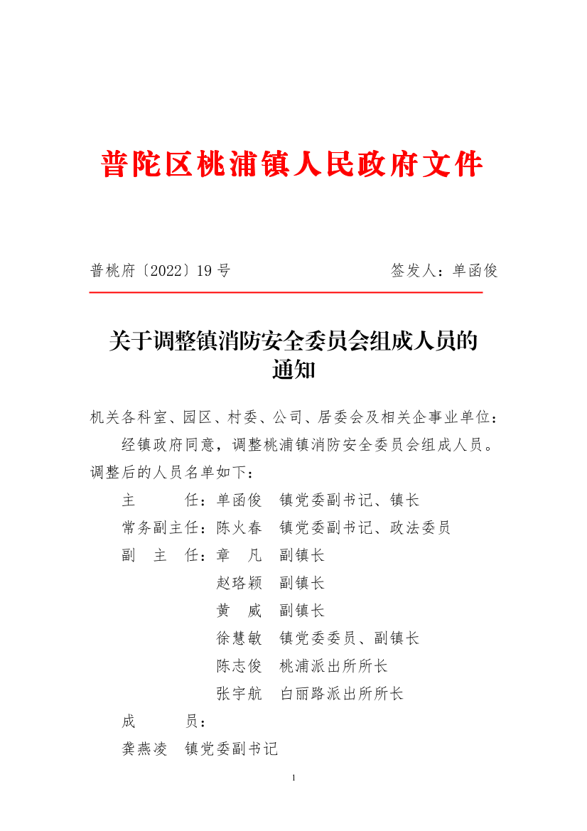 经镇政府同意,调整桃浦镇消防安全委员会组成人员。调整后的人员名单如下: