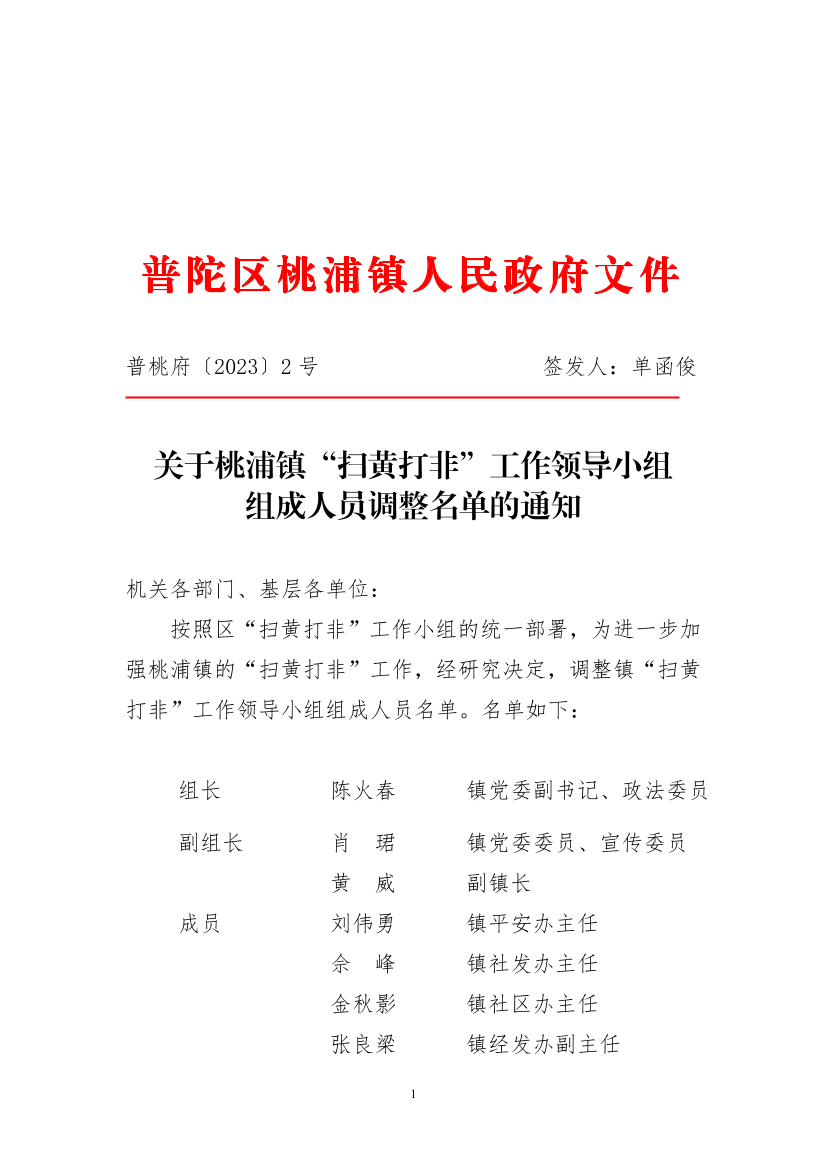 关于桃浦镇“扫黄打非”工作领导小组组成人员调整名单的通知