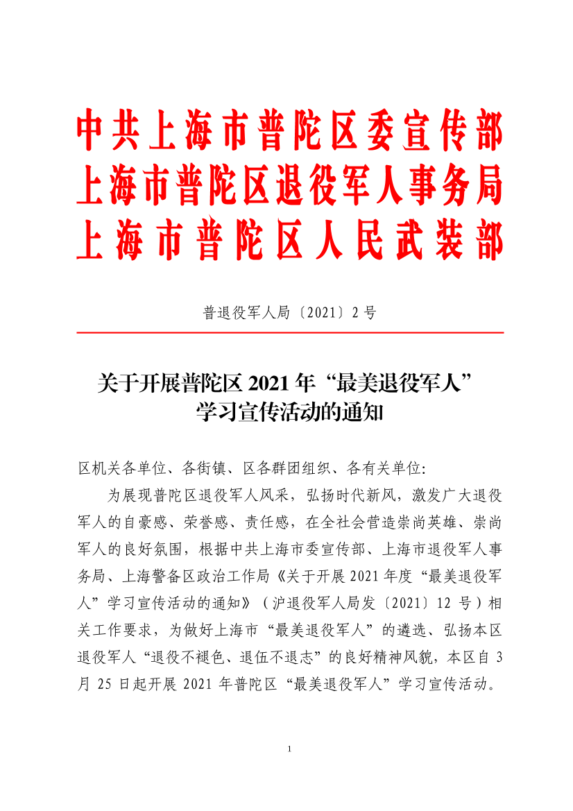 关于开展普陀区2021年“最美退役军人”学习宣传活动的通知